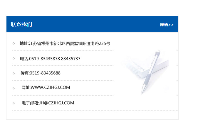 地址:常州市新北區友邦商務大廈1幢16、17層  電話:0519-85101652  傳真:0519-85112595  郵編:213022  網址:www.cz-jiayue_cn.zbruigu.com  郵箱:xiajifengaa@163.com